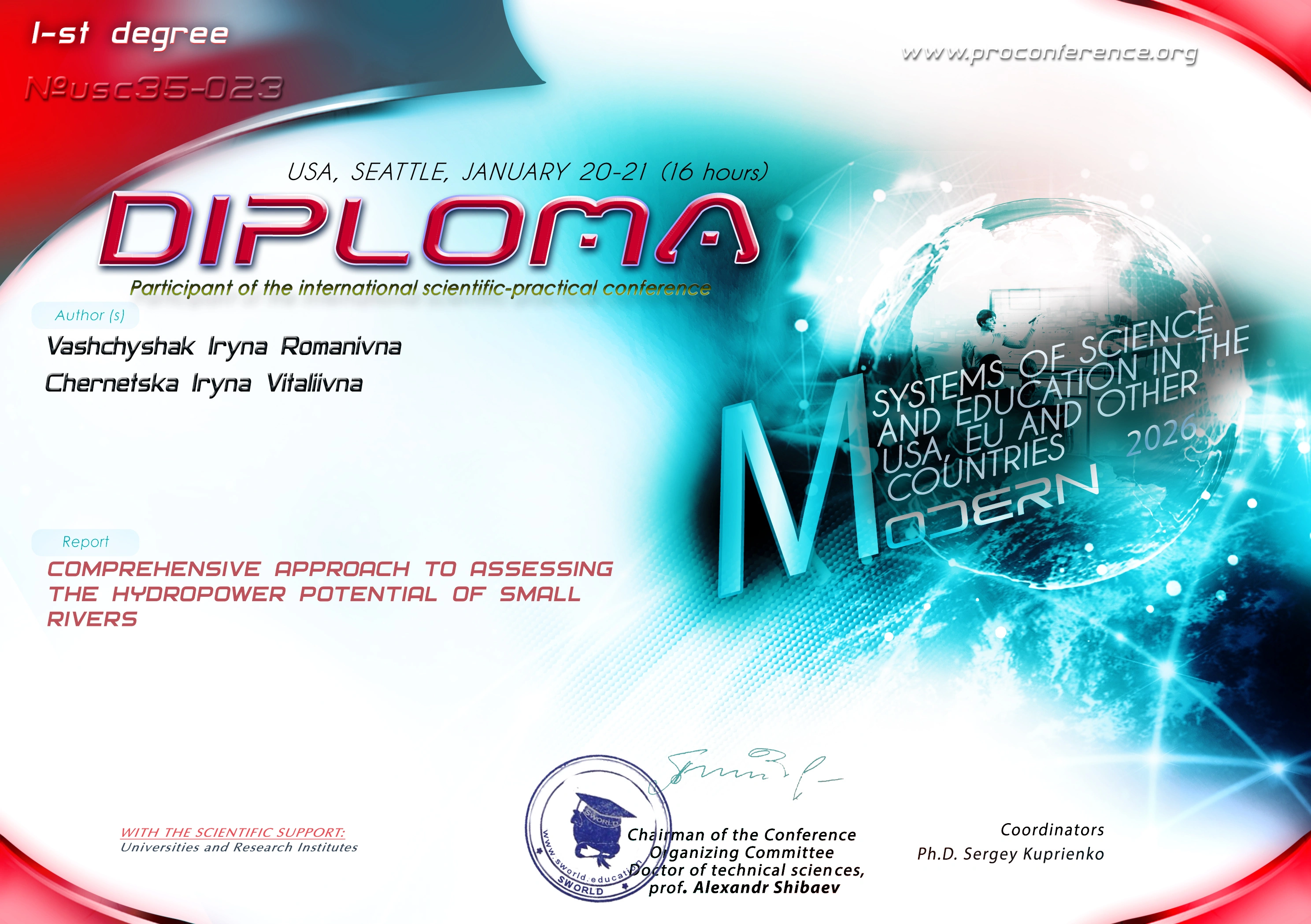 https://os4.nupp.edu.ua/admin/item/62599 - Vashchyshak I. R., Chernetska, I.V. (2026). Comprehensive approach to assessing the hydropower potential of small rivers. Series "SW-US Conference Proceedings", "Modern systems of science and education in the USA, EU and other countries '2026", №35 on January 21, 2026, 1(usc35-01), 11-15. (Index Copernicus International)