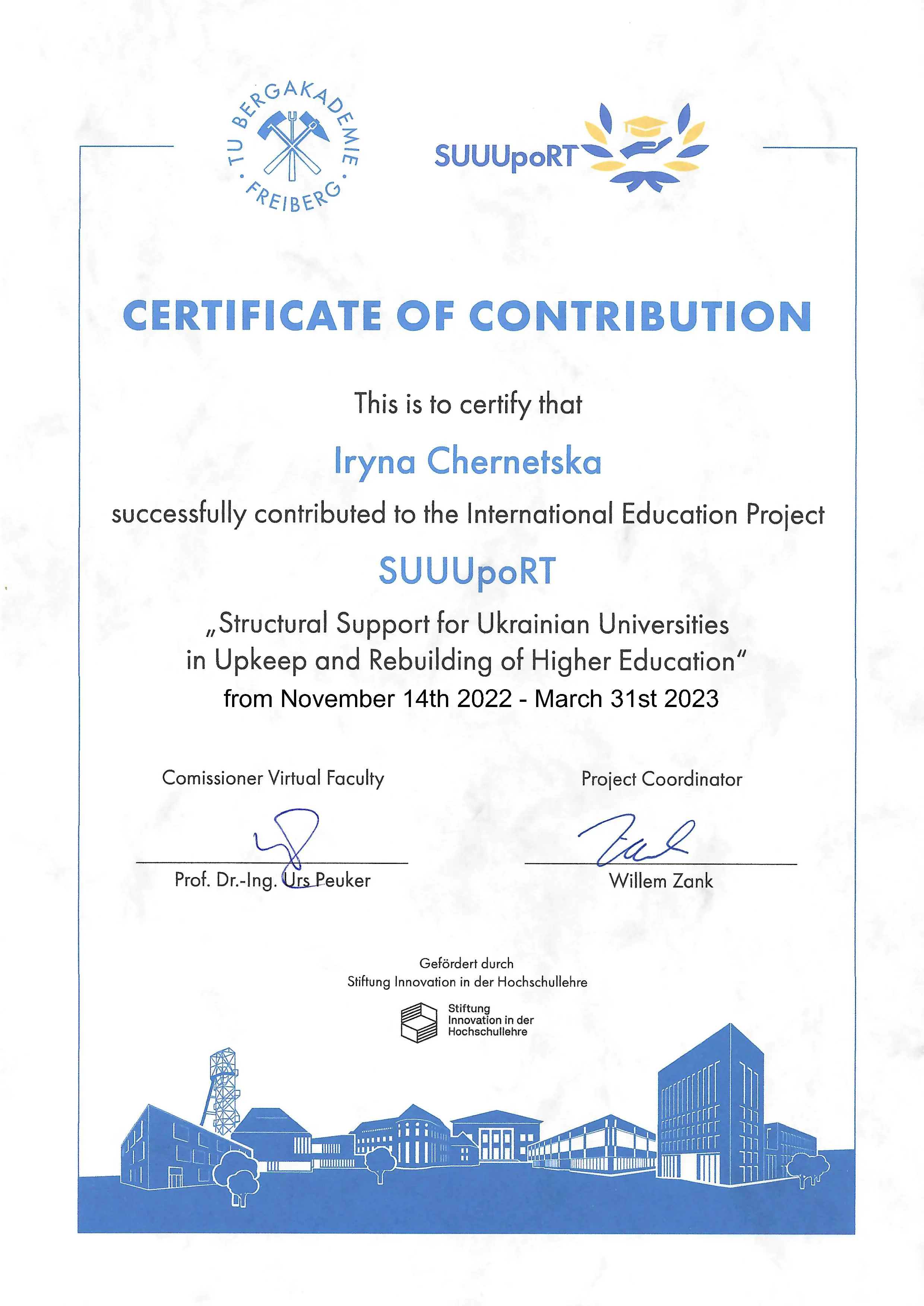 - Faculty of Education University of Bialystok, програма: "Teaching and research in a contemporary university: challenges, solutions, and perspectives", 16.03.2023-14.04.2023, сертифікат №12 від 14.04.2023, 180год/6кр.