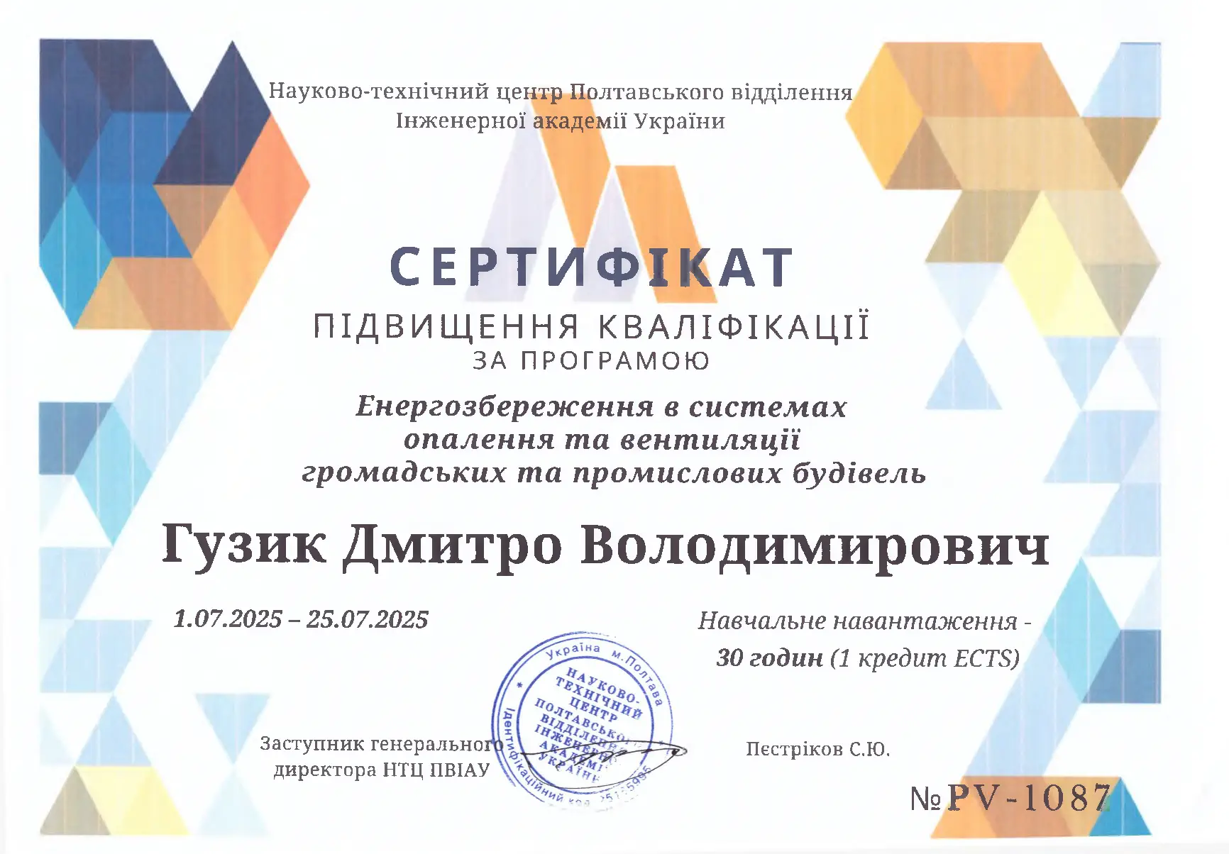 - Впровадження новітніх енергоефективних технологій у підготовленні фахівців-теплоенергетиків у Полтавській політехніці / Д.В. Гузик // Матеріали ІІI Міжнародної науково-практичної конференції «Зелене будівництво» (16-17 квітня 2024 року, Київ). Київ: КНУБА, 2024.