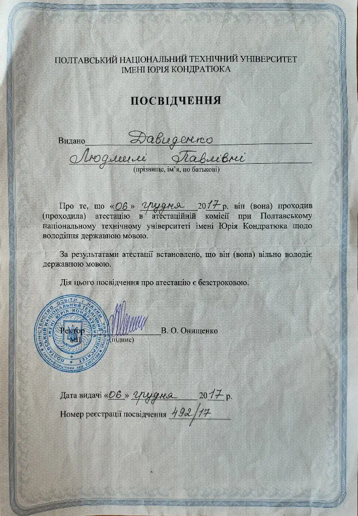 - Спеціаліст Полтавський державний педагогічний інститут ім. В.Г. Короленка, спеціальність «Фізика та математика», 1991 р.