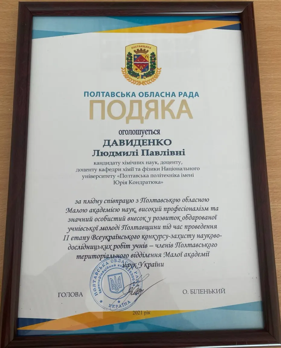 - Л.П. Давиденко, Д.В. Усенко, Т.А. Письменна Удосконалення методів викладання курсу фізики в змішаній та дистанційній формі в умовах військового стану // Тези 75-ї наукової конференції професорів, викладачів, наукових працівників, аспірантів та студентів Національного університету «Полтавська політехніка імені Юрія Кондратюка» (Полтава, 02 травня – 25 травня 2023 року). – Полтава : Нац. ун-т ім. Юрія Кондратюка, 2023. – Т. 2. – C. 414-416.