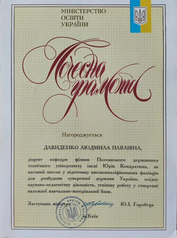 - Кандидат хімічних наук, спеціальність «Фізична хімія», 1993 р.