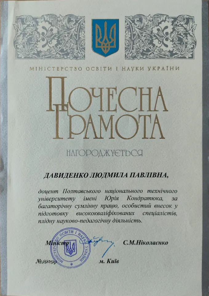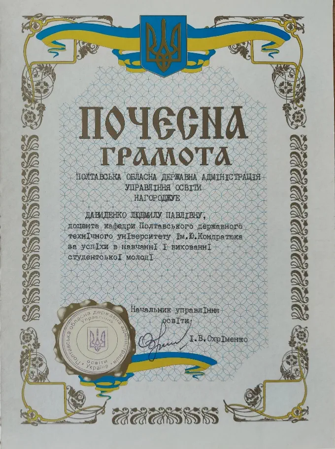 - Давиденко Л.П. Формування контингенту студентів технічних спеціальностей університету // "Znanstvenamisel" journal Slovenskacesta 8, 1000 Ljubljana, Slovenia, №14/2018 vol.2. р.6-8.