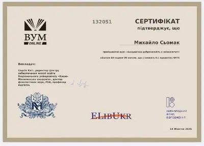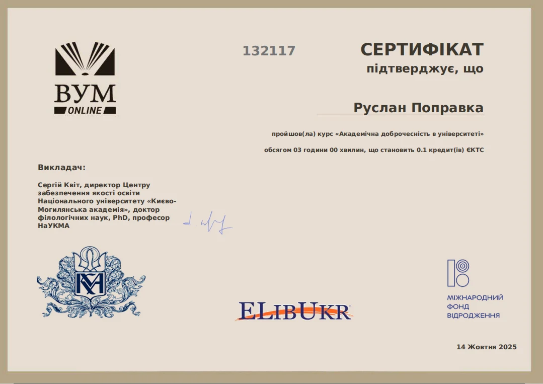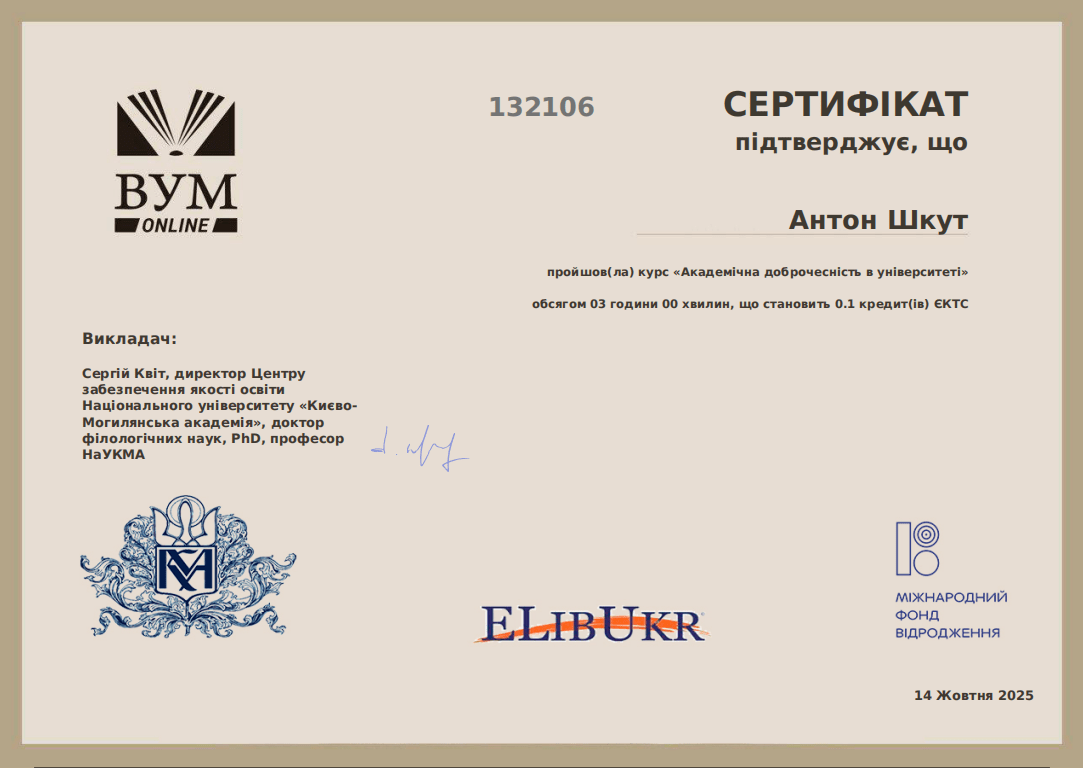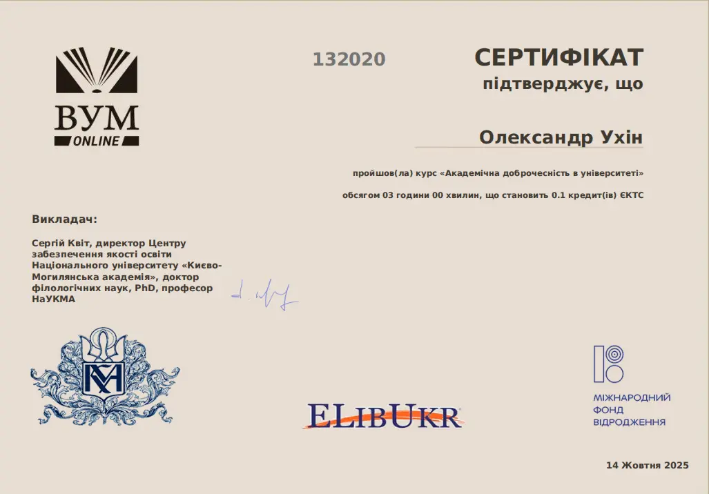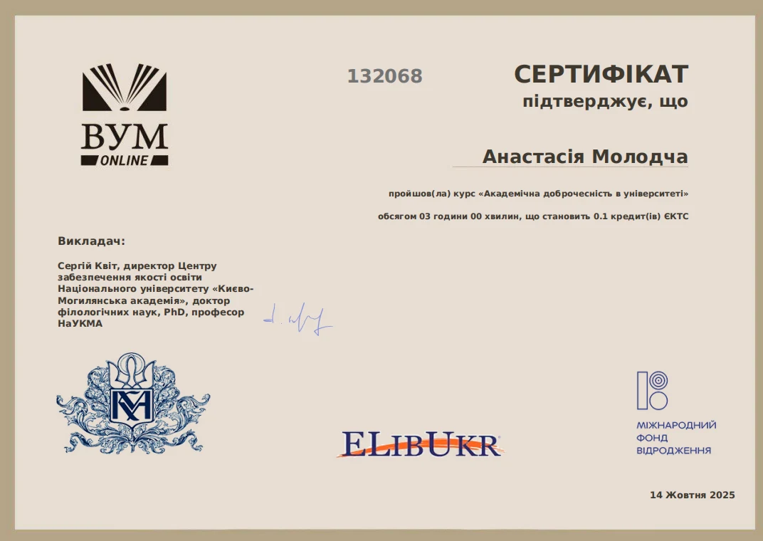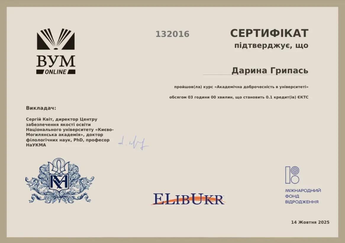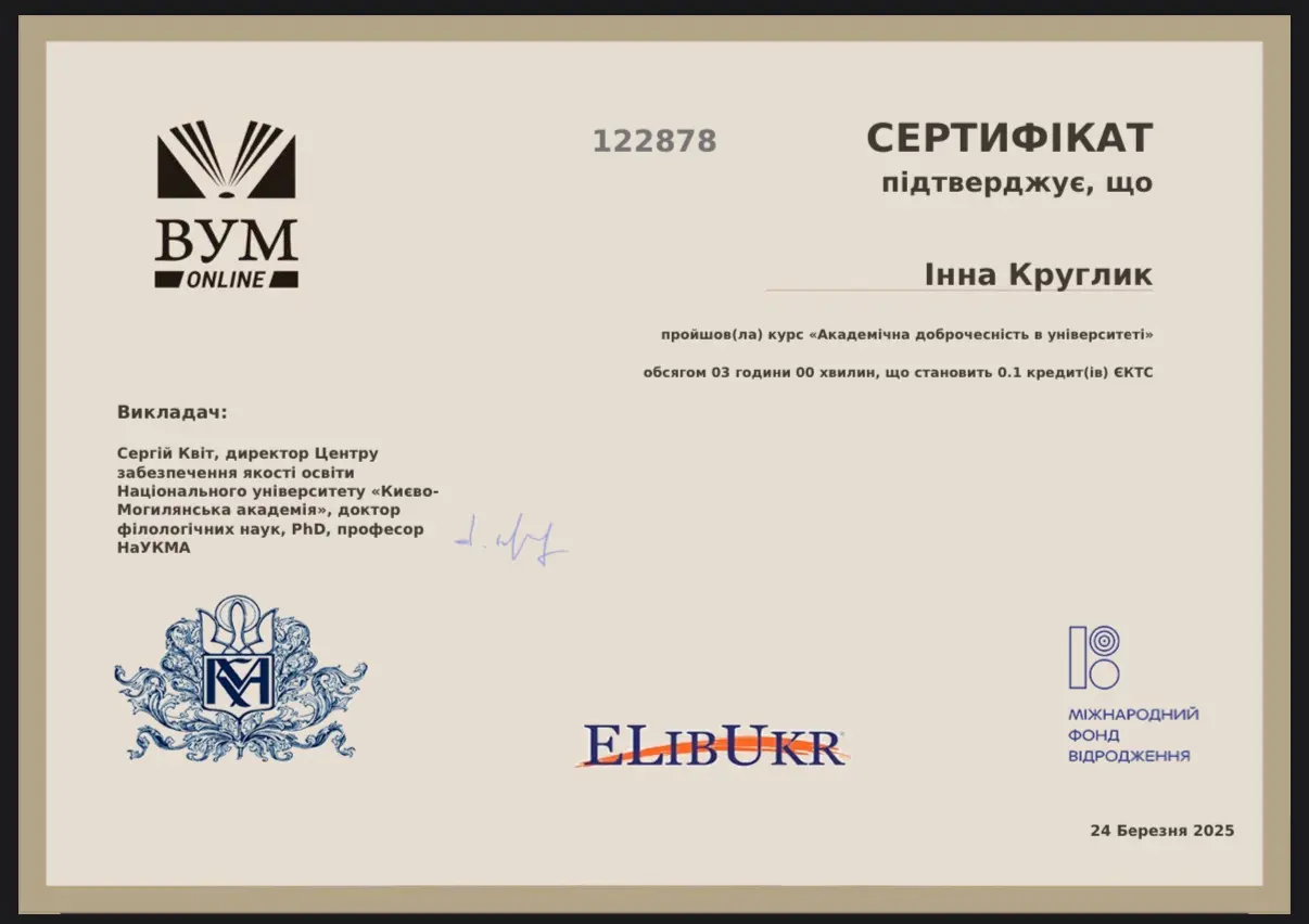 Для підвищення знань щодо норм та принципів академічної доброчесності ви можете скористатися курсами на онлайн-платформах, в тому числі курс “ Академічна доброчесність в університеті” https://vumonline.ua/course/academic-integrity-at-the-university/