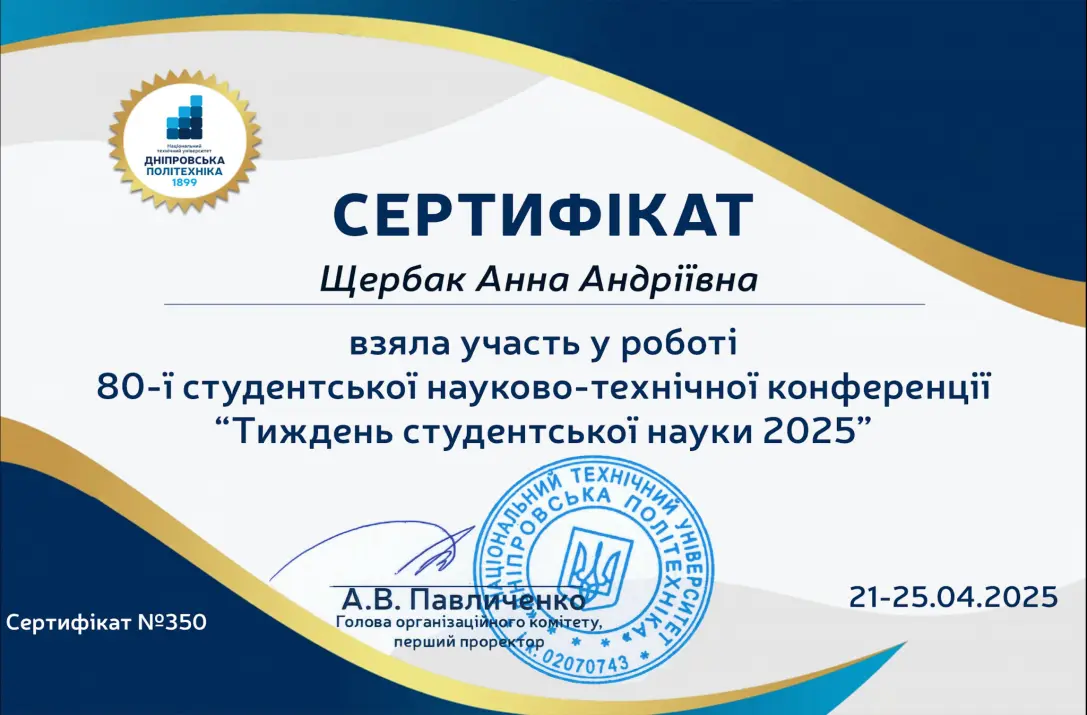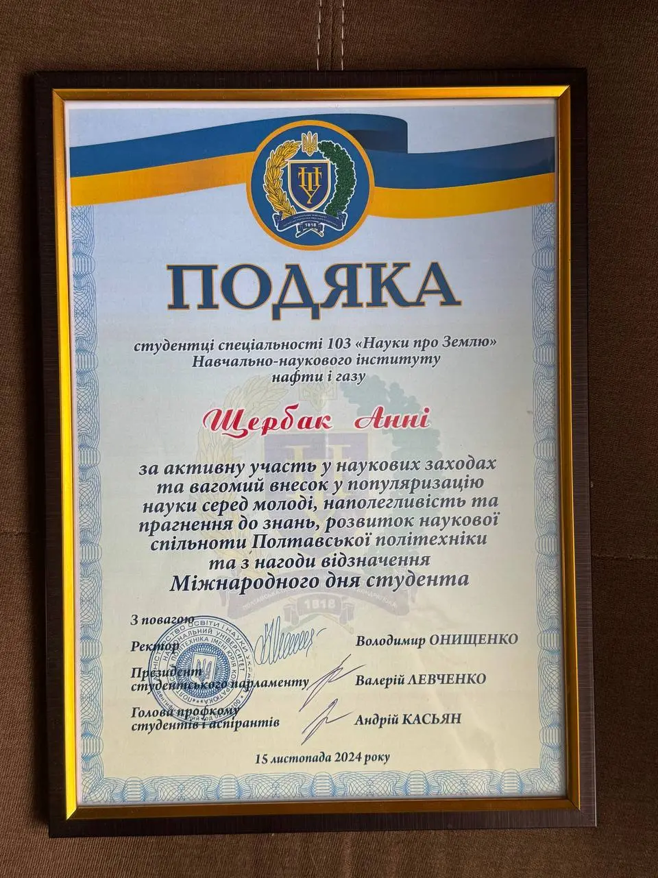 Переможець І туру конкурсу-захисту наукових робіт зі спеціальності науки про Землю в університеті. Тема “УМОВИ ФОРМУВАННЯ ПАСТОК ВУГЛЕВОДНІВ У ДЕВОНСЬКИХ ВІДКЛАДАХ ПІВДЕННОЇ ПРИБОРТОВОЇ ЗОНИ ДДЗ” Щербак А. Керівник Михайловська О.В.
