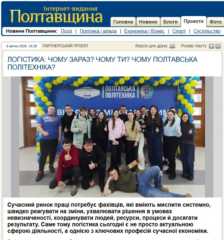 5 червня 2025 року студенти Національного університету «Полтавська політехніка імені Юрія Кондратюка» отримали унікальну можливість побачити будівельні процеси під час екскурсії на будівництво майбутнього житлового комплексу у місті Полтава. Генпідрядником даного об’єкту є ТОВ «Енерготел», що входить в групу компаній «Ангро». Здобувачі пройшли інструктаж з техніки безпеки. Познайомилися з логістичними процесами, що відбуваються на будівельному майданчику: від вантажно-розвантажувальних операцій до обліку та розподілу будівельних матеріалів, таких як цегла, газоблок та цемент, розміщених на палетах. Дізналися про організацію робіт, умови праці та особливості здійснення будівництва, що дозволило краще зрозуміти логістичні процеси.