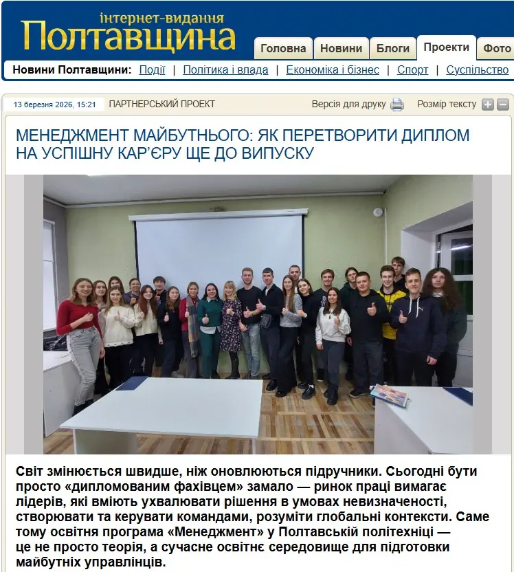 Завдяки глибоким знанням, одержаним під час навчання за спеціальністю «Менеджмент», наші випускники впевнено реалізують себе у обраній сфері діяльності і є справжнім предметом гордості Полтавського національного технічного університету імені Юрія Кондратюка.