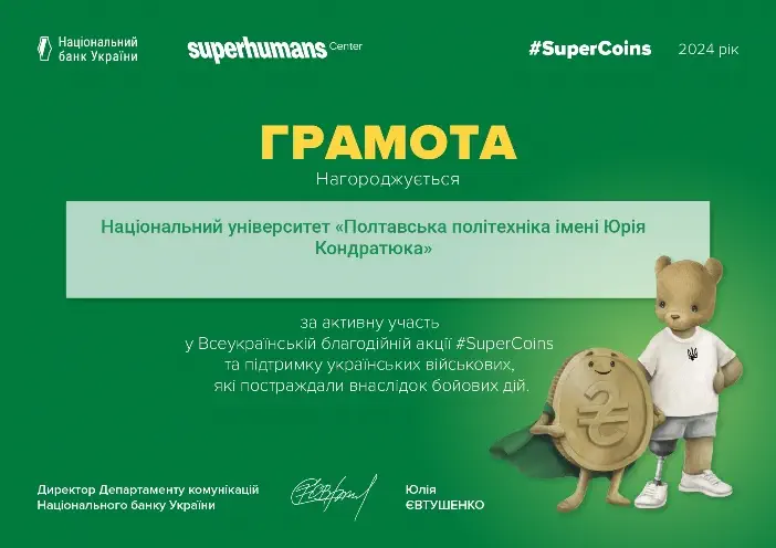 У рамках масштабної благодійної акції #SuperCoins, ініційованої Національним банком України та Superhumans Center, студенти, викладачі та співробітники Національного університету «Полтавська політехніка імені Юрія Кондратюка» об’єднали зусилля задля збору коштів на підтримку постраждалих внаслідок війни українців.