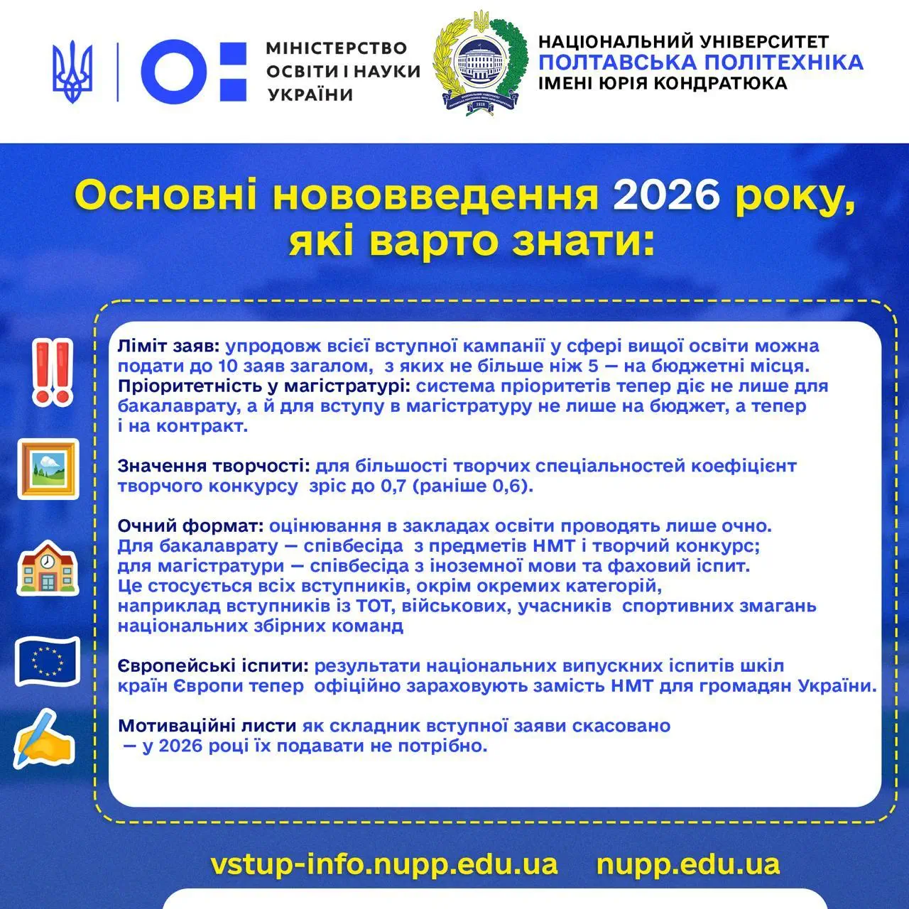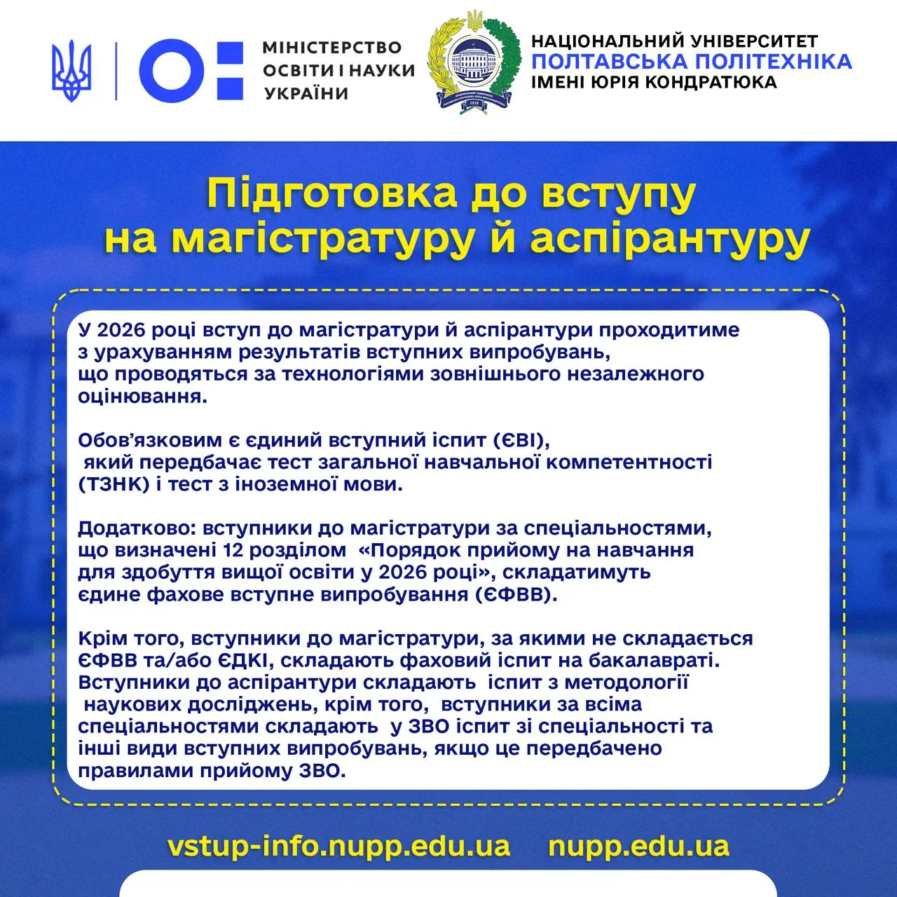 Відповідно до проєкту Порядку прийому на навчання для здобуття вищої освіти в 2026 році для охочих вступати до магістратури у 2026 році проводитимуть єдиний вступний іспит (ЄВІ) та єдине фахове вступне випробування (ЄФВВ).